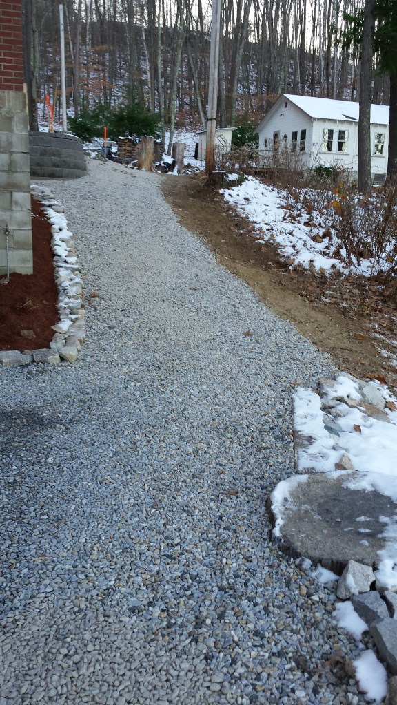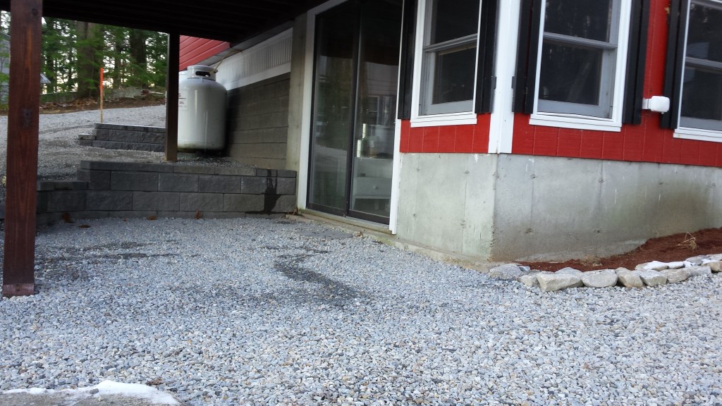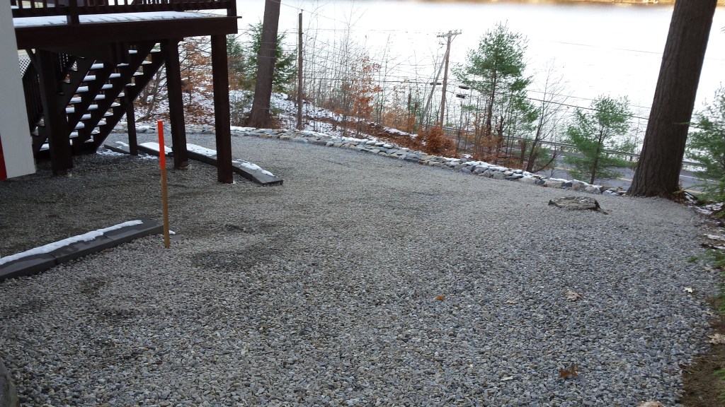 At this cottage in Alton, NH our team laid a new gravel driveway, parking, and walkway, as well as built a new retaining wall.